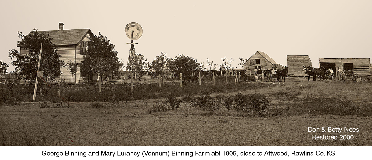 This is a later family portrait of the whole Mary L. Vennum Binning family except there was one more child born about a year after this picture in 1906. This is the outside view of the Mary Lurancy Vennum Binning farm in Kansas. This is Mary L. Vennum Binning, her sister and father and probably brother thought to be when the mother Lurinda Vennum pasted away in 1901.