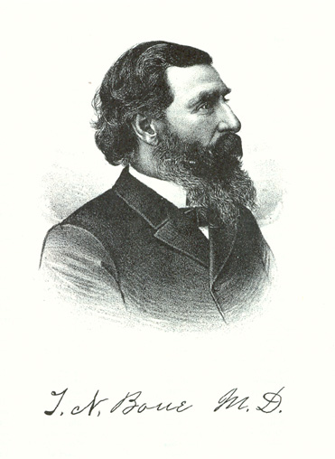 By their union this worthy couple became the parents of seven children, and, with the exception of one who died in infancy, all are yet living at this writing, in the autumn of 1892, as follows: Josephine, James M., T. Newton, John Austin, Simpson M. and Eluis Scott. The mother of this family is still living on the old homestead in Fountain County, Ind., six miles south of Veedersburg, with the youngest son. Mr. Boue died in May, 1880. Under the parental roof the Doctor was reared to manhood. He attended the public schools in his youth and his literary education was completed in an academy in Ladoga, Ind. In looking about him in choice of some profession or occupation which he wished to make his life work, he chose the practice of medicine, and for three years read medicine, after which he attended lectures at Rush Medical College of Chicago, from which he was graduated in 1866. In April, 1864, he located in Rantoul, Ill., where he spent about three months, and in July he came to Loda, opened an office and has since engaged in the practice of his chosen profession in this place. His skill and ability have won him a liberal patronage and a recognized position in the ranks of his professional brethren. On the 3d of June, 1867, Dr. Boue married Miss Effie L. Burnette, daughter of Mr. and Mrs. S. Burnette, of Galva, Ill. Her death occurred on the 23d of October, 1875, and a number of years later, on the 13th of November, 1879, he was again married, his second union being with Miss Emma Kelsey, a daughter of Barnabus and Susan Kelsey, of Byron, Ill. There were two children born unto them, daughters, June and May. The death of Mrs. Boue occurred on the 23d of December, 1887, and on the 6th of March, 1889, the Doctor married Miss Minnie Carrington, daughter of Milton and Nancy (Sears) Carrington, of Loda, Ill. In his political affiliations, Dr. Boue is a Democrat,,and socially is a member of the Masonic fraternity, belonging to Abraham Jonas Lodge No. 316, A. F. & A. M., of Loda, and has been its Worthy Master for twenty years; Ford Chapter No. 138, R. A. M.; and Mt. Olivet Commandery No. 38, K. T., of Paxton. He has held various offices of honor and trust. He is a member of the Christian Church and his wife holds membership with the Congregational Church. Both are highly respected people whose friends and acquaintances throughout the community are many. In the long years of his residence here the Doctor has gained a high reputation as a practitioner and his liberal patronage is well deserved.