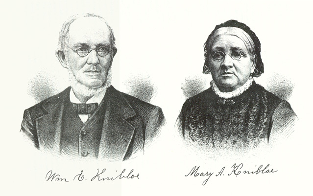 WILLIAM KNIBLOE, an early settler of Douglas Township, was born in Sharon Township, Litchfield County, Conn., his birth having occurred February 17, 1820. He is a son of Thompson and Keziah (Wing) Knibloe. His great-grandfather Knibloe was a Scotch-Presbyterian minister, who emigrated from Edinburg prior to the Revolutionary War. He followed his profession in this country during his entire life. The grandfather of our subject followed agricultural pursuits chiefly. His father was born in Litchfield County, Conn., while his mother was born on Cape Cod and with her parents emigrated to Litchfield County, where she married Thompson Knibloe, a farmer. His death occurred when our subject was a lad of about twelve years. His mother afterward married Benjamin Myers, and moved to Allegany County, N. Y., where she spent her last days. By her first marriage she had four children, of whom William is the only one living. Our subject is the oldest of the family. Having remained on the farm until sixteen years of age, he was apprenticed to the cabinet-maker's trade, serving five years, working in the summer from sunrise to sunset, and from September until March working until nine o'clock at night. On tile 7th of April, 1842, he married Mary A. Dakin, who was born December 22, 1821, in Dutchess County, N. Y., and is a daughter of Talmai and Clarissa (Yerrington) Dakin, both of whom were natives of tine Empire State. Her grandfather Dakin was a Baptist minister of English descent. Mrs. Knibloe's parents spent their entire lives in the State of their nativity. She is the second in a family of seven children, and she and a sister, Mrs. Lucy Vanness, who lives in Lamont, Cook County, Ill., are the only ones who survive. To Mr. and Mrs. Knibloe has been born a family of three children: Anna, who died in the prime of womanhood; Harriet, who is the wife of N. J. Henry and resides in Chicago; and the youngest, Walter, who married Addie Clark, is a graduate of the State University at Champaign and has been for six years Principal of the schools of St. Augustine, Fla. In 1843, the subject of this sketch started for the West, going first to Chicago. He remained there for a year and then sent for his wife. At that time Chicago contained about seven thousand inhabitants and was a veritable swamp. For seven years, he worked in a shop, of which he was foreman part of the time. He then started in business for himself and, with a partner, carried on a shop in that city. In 1858, he came to Iroquois County and, in company with Edward Silver, purchased a half-section of land in Douglas Township. This he improved and in time made of it a good farm. Having sold his property, he ran the Sturgis Farm for twenty-five or twenty-six years. He is the owner of one hundred and seventy-two acres of good land, and his present prosperity is the result of the united efforts of himself and wife. In 1891, within his family he removed to Gilman, where he has a pleasant and hospitable home. In his political sympathies, Mr. Knibloe was formerly an advocate of the Democracy, but since the rise of the Republican party he has been identified with its interests. He has served as Highway amid Ditch Commissioner, helping to cut many of the ditches that have so much improved this county. He was a member of the first Odd Fellows' society of Chicago, called the Union Lodge, and Mrs. Knibloe helped to make the first carpet that covered that lodge room. No people in the county are held in higher regard than Mr. Knibloe and his estimable wife. He has made farming his chief life occupation and has devoted himself to that pursuit in a quiet, unassuming manner, at the same time faithfully discharging his duties of citizenship.