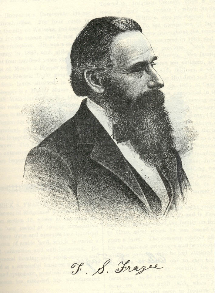 The life record of our subject is as follows: A native of New Jersey, he was born in Newark on the 4th of February 1830. His parents were Tuner and Martha (Meeker) Frazee. His father was also a native of New Jersey, and was of French descent. By trade he was a shoemaker. In 1838, he removed to Warren County, Ohio, where he resided for nineteen years, when, in 1857, he came to Illinois. He took up his residence in Ridgeland Township, Iroquois County, upon a forty-acre tract of land on section 7, which he purchased from his son William, who pre-empted it from the Government. To the occupation of farming he devoted his energies throughout the remainder of his life. His death occurred in 1881, and his wife passed away the year previous. Both were members of the Baptist Church. The family of this worthy couple numbered ten children, as follows: Mary. who died in 1836; William, a valiant soldier of Company D, One Hundred and Thirteenth Illinois Infantry, died in 1861 at Camp Butler, Springfield, from disease contracted in the Yazoo Bottoms near Vicksburg, Miss, having served over two years; Aaron, a farmer and blacksmith residing near Franklin, Warren County, Ohio; Frederick, who was a twin brother of Aaron and died in infancy; James, who enlisted for the late war in August, 1862, served over a year as a private of Company D, One Hundred and Thirteenth Illinois Infantry, and is now engaged in farming in Michigan; Sarah E., who died in 1850; Julia, wife of John McMillan, a farmer residing near Chatsworth, Livingston County, Ill.; Lewis D., who is engaged in agricultural pursuits in Ridgeland Township; and John T., also a farmer residing in Ridgeland Township. Our subject spent the first eight years of his life in the city of Newark, N. J., and in Essex County, and then accompanied the family on their removal to Ohio. After which he was reared to manhood upon a farm. The common schools afforded him his educational privileges and he remained at home with his parents until he had attained his majority, when he started out to earn his own livelihood This he did by working for a year as a farm hand at $6 per month. He then operated a farm on shares until 1855, when he left the Buckeye State and came to Iroquois County, Ill. Here he purchased eighty acres of railroad land on section 18, Ridgeland Township, making his home thereon, until 1872, when he leased one hundred and sixty acres of land on section 15, for eleven years. On time expiration of the lease he purchased the same, and since that time he has extended the boundaries of his farm until now two hundred and forty acres of rich land yield to him a golden tribute in return for his care and cultivation.