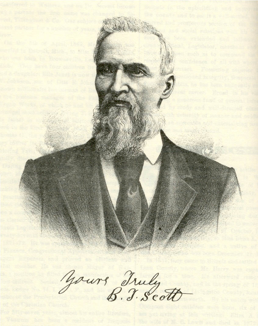 Thomas married Miss Susan Anderson, and with their six children they make their home in Davenport, Iowa. Matilda is the widow of Andrew J. Endsley, who was a prominent citizen of Milford, where he died about seven years ago, leaving three children. William T. was joined in wedlock with Miss Martha Rothgib, daughter of George Rothgib, a native of Germany. They reside on a farm five miles south of Milford with their four children, two sons and two daughters. Bluford T. is the next younger. David married Miss Hanks, and both are now deceased. Walter C. married Miss Frances Bumgardner, by whom he has six children, and resides near Smithland, in Shelby County, Ind. Theodore, the youngest of the family, married Jennie Hefner, by whom he has two children, a son and daughter. They are now living near Rossville, Vermilion County, Ill. The subject of this sketch spent his early life in the State of his nativity, and after attaining to mature years was married, in December, 1854, the lady of his choice being Miss Eliza Bartlett. One child, a son, was born unto them, but died in infancy. The mother was called to her final home in January, 1856. Mr. Scott was again married, on the 2d of July, 1864, his second union being with Miss Elizabeth Cosby, a daughter of George and Mary E. (Stiles) Cosby. Four children were born of this union, of whom three are yet living: Rowena, born January 17, 1865; Florence, born in September, 1867; and Robert, born August 9, 1870. Otis, the third child, was born in October, 1868, and died on the 7th of March, 1882. The year 1864 witnessed the arrival of Mr. Scott in Iroquois County. It was in the month of July, that he and Daniel C. Anderson purchased a farm of two hundred acres in Milford Township, but our subject soon sold, and in 1869 bought one hundred and twenty acres in Lovejoy Township, on which he lived fifteen years. There his wife died July 10, 1880. On the expiration of that period he sold out and purchased a farm of one hundred and seventy acres two miles west, and one-half mile south, of Milford. This was in 1884, and for seven years he made his home thereon, successfully following agricultural pursuits. In December, 1891, he took up his residence in the village of Milford, where he is now living a retired life, enjoying a well-earned rest and the fruits of his former labor. When a young man, he worked long and earnestly, and thereby acquired a comfortable competence, which now supplies him with all the necessaries and many of the luxuries of life. Socially, Mr. Scott is a member of Milford Lodge No. 253, I. O. O. F., and politically, is a Democrat. He is highly respected by all who know him, for during the thirty years of his residence in Iroquois County his life has ever been such as to win him universal confidence.