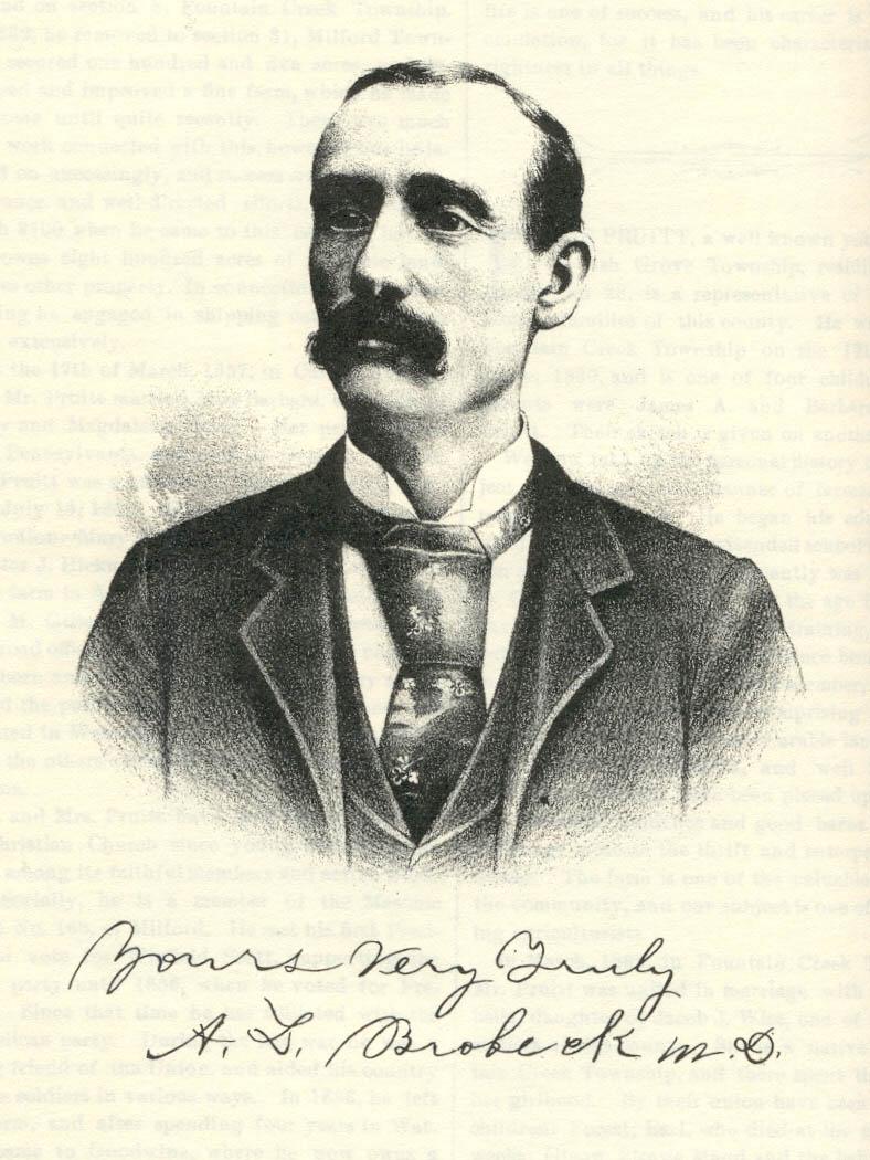The Doctor was born in Washington County, Tenn., January 10, 1853, and is a son of D. K. and Harriet T. (Miller) Brobeck. His father was born in Tennessee, August 7, 1827, and is still living. He is a blacksmith by trade and owns a farm, the same upon which our subject was reared. In his younger years he also engaged in teaching. Throughout life he has met with excellent success and is now in comfortable circumstances. In politics, he is a supporter of Republican principles. His wife was born in Tennessee, August 20, 1820. Both parents are members of the Presbyterian Church. Their family numbered twelve children, five of whom are yet living: Nannie is the wife of A. S. Stover, a farmer of Tennessee; the Doctor comes next; James is a carpenter and joiner, residing in Momence, Ill.; Addie resides with her father, and John, of Wellington, is studying dentistry. Dr. Brobeck spent his boyhood days upon his father's farm in the State of his nativity. His education was acquitted in the public schools of Brownsboro, after which he attended Laurel Hill Academy, and subsequently became a student in Washington College, one of the pioneer colleges of the country. It was founded in 1772, by Rev. Samuel Doak, D. D., of Princeton College. He came to Tennessee, and preached his first sermon while sitting on a horse. This was in the early days, when the country was still an almost unbroken wilderness. Our subject has in his possession a portrait, which was taken by the artist through the keyhole of the door, as the old Doctor was very averse to having his likeness taken. Dr. Brobeck remained in Washington College for about three years as a Latin student, and afterward studied in Greenville and Tusculum Colleges. The Doctor began reading medicine under the eminent practitioner, Dr. Alex Brabson, of Limestone, Tenn., who was an own cousin of his mother, and began to practice while under the direction of Dr. Brabson, continuing his connection with the gentleman for a period of four years. In the fall of 1883, Dr. Brobeck became a student in the medical department of the University of Louisville, Ky., from which he was graduated in 1885. He stood among the foremost in his class, which numbered seventy-six. On leaving school, he returned home and again took up practice, continuing until 1885, when he came to Illinois. October 28, 1886, the Doctor married Miss D. A. Pruitt, daughter of Joseph and Augusta (Hind) Pruitt. Two children have been born of this union, both daughters, Nellie E. and Hazel. On coming to this State, Dr. Brobeck located at Wellington, where he has since resided. His skill and ability have won for him a high reputation and secured him a liberal patronage, which he well deserves. His neat and well-appointed office is supplied with the finest instruments used in surgery. He also has a compressed air apparatus used in catarrhal and respiratory diseases, and an excellent physician's microscope, manufactured in London. He has one of the finest medical libraries to be found in Central Illinois, and his table is always supplied with the leading medical journals and periodicals. He is a constant student of his profession, a tireless worker, and his skill is duly recognized by his professional brethren. The obstacles and difficulties in his path he has overcome by indefatigable labor and perseverance. In manner, the Doctor is a courteous and affable gentleman, who wins friends wherever he goes. In politics, he is a stalwart Republican, having supported that party since he cast his first Presidential vote for R. B. Hayes. When he came to Illinois he was one of the Trustees of Washington College. Himself and wife are both members of the Presbyterian Church, in which the Doctor serves as Elder. This honorable, upright life has won him universal esteem and he is numbered among the county's best citizens.