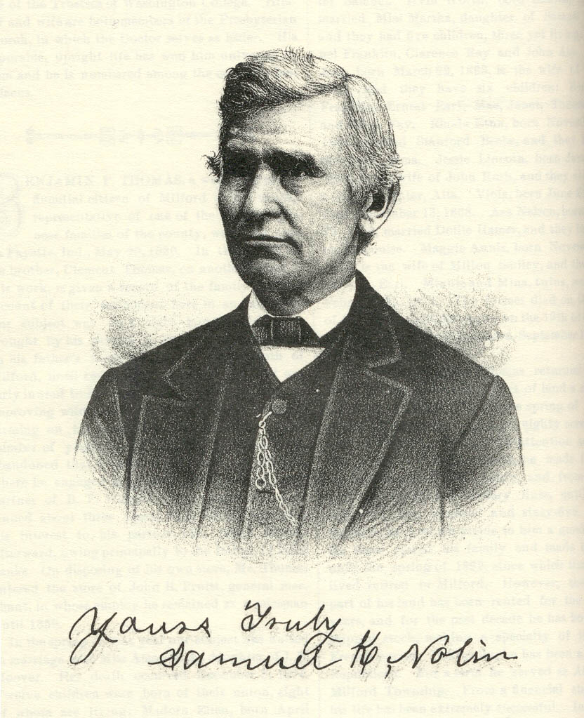 The paternal grandfather of our subject, Richard Nolin, was a resident of Virginia, and removed from that State to Kentucky, where he became acquainted with the Kirkpatricks, the maternal ancestors of Samuel K. They resided in a wild region, and together the families fled from the Indians, locating in Ross County, Ohio. At that time there were no houses but log cabins, and these settlements were widely scattered. Both the paternal and maternal grandparents died and were buried in Ohio. Thomas Nolin, the father of our subject, was born in the Buckeye State and reared on the frontier. He married Jane Kirkpatrick, also a native of Ohio, and unto them were born eight children, six sons and two daughters: Ruth, Samuel K., John, Minerva, George W., Richard T., William J. and Austin W. In 1831, the parents removed to Indiana, stopping in Fountain County, and four years later locating in Benton County, where they reared their family. The father bought eighty acres of land and entered a tract of one hundred and twenty acres from the Government. He carried on farming until his death, which occurred in 1840. His wife survived him many years. Samuel K. Nolin, of this sketch, was a lad of only ten summers when with his parents he went to Indiana. In Benton County he was reared to manhood, being early inured to the arduous labor of developing and improving wild land. In 1849, he came to Illinois, hoping to better his financial condition. Settling in Stockland Township, he located four hundred acres of Government land, and with characteristic energy began to cultivate the same. Acre after acre was placed under the plow, and in the course of time, where once was wild prairie, waving fields of grain delighted the eye, telling of bounteous harvests. Through his industrious and persevering efforts, his financial resources were increased and he was thus enabled from time to time to extend the boundaries of his farm by making additional purchases. His possessions now aggregate eight hundred and forty acres in Stockland Township, three hundred and sixty acres in Benton County, Ind., and one hundred and sixty-six acres in Prairie Green Township, Iroquois County, and he is extensively engaged in grain and stock-raising. He keeps on hand excellent grades of horses, cattle and hogs, and this pursuit is an important branch of his business. We now turn from the public to the private life of Mr. Nolin. He has been twice married. His first union, celebrated in 1853, was with Miss Rachel Dawson, daughter of Elisha and Polly Dawson, but her death occurred in September, 1854. In August, 1857, he was again married, Miss Clarissa Coffelt becoming his wife. Four children were born unto them, but the second died in infancy. Mary is now the wife of George Voliva, and they have three sons, Robert, Jesse and Leroy. They reside upon a farm in Benton County, Ind., which belongs to her father and was formerly owned by her grandfather. William, a resident farmer of Prairie Green Township, was married to Miss Hulda Peterson, by whom he has two children: Clarissa and a baby. Matilda is the wife of William Nicle, who is engaged in agricultural pursuits in Stockland Township. The mother of this family departed this life in January, 1890, and her death was mourned by many friends as well as by her immediate family. In politics, Mr. Nolin is a Democrat, and for two terms has held the office of Township Assessor. His life has been remarkably successful and he may truly he called a self-made man. Dependent upon his own resources, he started out in life for himself, overcoming the obstacles and difficulties in his path by perseverance ad enterprise. Steadily he has worked his way upward, until now he occupies a position among the wealthy and influential citizens of his adopted county.