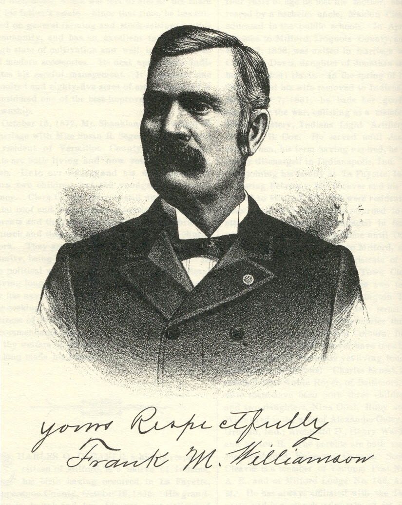Mr. Williamson was born September 6, 1843, in Stockland Township, Iroquois County, and is a son of B. P. and Margaret (Williams) Williamson. The grandfather of our subject was a native of Virginia, and was of German descent, while his wife was born in Ireland. In 1832, they emigrated to Iroquois County, and here spent the rest of their lives. Their son B. P. was born in Ohio, April 7, 1816, and was therefore but sixteen years of age when he accompanied his parents to this County. On reaching man's estate, he crossed the line into Indiana, and married June 12, 1838, Miss Williams, who was born in that State December 20, 1820. The young couple began their married life in Iroquois County. Mr. Williamson entered land from the Government, situated at Crab Apple Grove in Stockland Township, on which he made his home until 1850, when he located near Milford, where he died February 3, 1890. Thus another of the pioneers passed away. He was highly respected man, and a valued citizen. His wife had preceded him to the spirit world, dying at the age of thirty-two. Our subject was the third in order of birth in their family of four sons and a daughter. He remained with his parents until nineteen years of age, and his boyhood days were spent in work upon the home farm or in attendance at the common district schools of the neighborhood. After the breaking out of the late war, he laid aside all other considerations, and responded to the call of duty, and on the 9th of August, 1862, he offered his services to the Government. He was assigned to Company E, Seventy-sixth Illinois Infantry, with which he did service for three years, or until his discharge on the 7th of August, 1865, after the close of the war. He was engaged in all of the battles from Columbus, Ky., through to Texas, the principal of which were the battles around Vicksburg, the siege of that city, and the battle near Jackson, Miss., where the Seventy-sixth lost about one-third of its men in killed and wounded. At Ft. Blakely the regiment lost heavily, thirty being killed. In May, 1892, the survivors of the regiment erected a fine monument to mark the resting-place and to perpetuate the memory of their comrades who fell in that bloody charge there. Before the close of the war he was made Sergeant. He was a faithful soldier, always found at his post, and of his army record he may well be proud. In 1865, Mr. Williamson returned from the war, and engaged in farming in this county. On the 21st of March, 1869, he was united in marriage to Miss Dina Slaughter, of this county. Her parents, William L. and Isabel (McClain) Slaughter, natives of New York and Pennsylvania, respectively, emigrated to Illinois in 1864. Four sons and two daughters have graced the marriage of our subject and his wife, but two are now deceased: Glennie E., the eldest, is a young man of twenty-two years, now attending the Valparaiso Normal College, of Indiana; William B. is also a student in the same college; Leni L. died February 2, 1892, at the age of seventeen years, two months and four days; Harlan is at home; and Margaret Isabella. There was also another child, born September 12, 1872, which died on the 16th of October of the same year. In 1870, Mr. Williamson purchased eighty acres of partially improved land in Prairie Green Township, on which he has made his home continuously since. He now owns a very fine farm of one hundred and sixty acres, under a high state of cultivation, and well improved with all the accessories of a model farm. In connection with his agricultural pursuits he is also a stockholder and Director in the State Bank of Ambia, Ind. He is a man of excellent business ability and by his perseverance, enterprise and well-directed efforts has achieved a success which has placed him among the substantial citizens of the community, and of which he is well deserving. In his political affiliations, Mr. Williamson is a Republican, having been a warm supporter of that party since he cast his first Presidential vote for U. S. Grant. He has held a number of official positions, was Supervisor for eight years, and has been School Director of his district for the long period of eighteen years, Collector two years, and Census Enumerator of his township for 1880. The prompt and able manner in which he ever discharges his public duties has won him high commendation, and led to his frequent re-election. Socially, he is a member of the Wellington Lodge No 785, I. O. O. F., and he and wife and son are members of the Christian Church. Mr. Williamson is not only recognized as an honored pioneer, but is also one of the valued and highly respected citizens of the community, whose worth and ability have won him the highest regard.