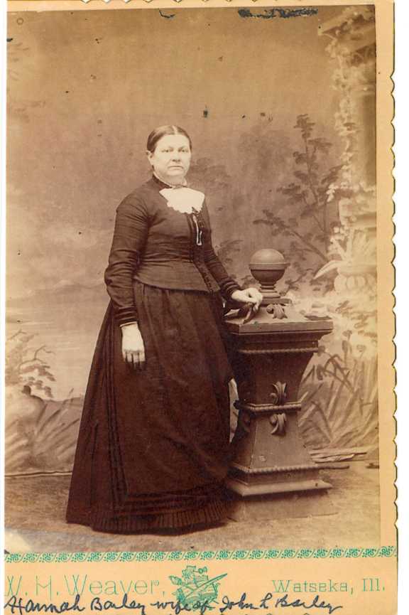 ![]() Unknown Bailey | Written on the back is "W.A. Bailey or brother". He doesn't really resemble W.A. Bailey or his brother, Mahlon. Could be one of the other brothers. Hopefully someone can assist in identifying this person. | ![]() Hannah Lyman Bailey | Hannah Lyman (Holston) was the second wife of John Lemon Bailey. They married in Iroquois County in 1871. She died 1891. |