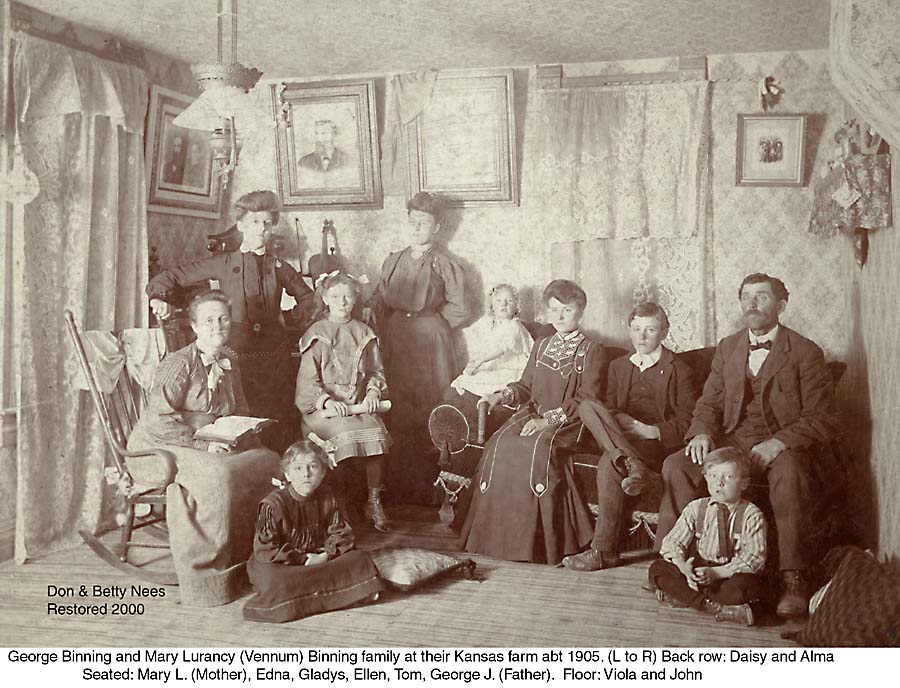This is a later family portrait of the whole Mary L. Vennum Binning family except there was one more child born about a year after this picture in 1906. This is the outside view of the Mary Lurancy Vennum Binning farm in Kansas. This is Mary L. Vennum Binning, her sister and father and probably brother thought to be when the mother Lurinda Vennum pasted away in 1901.