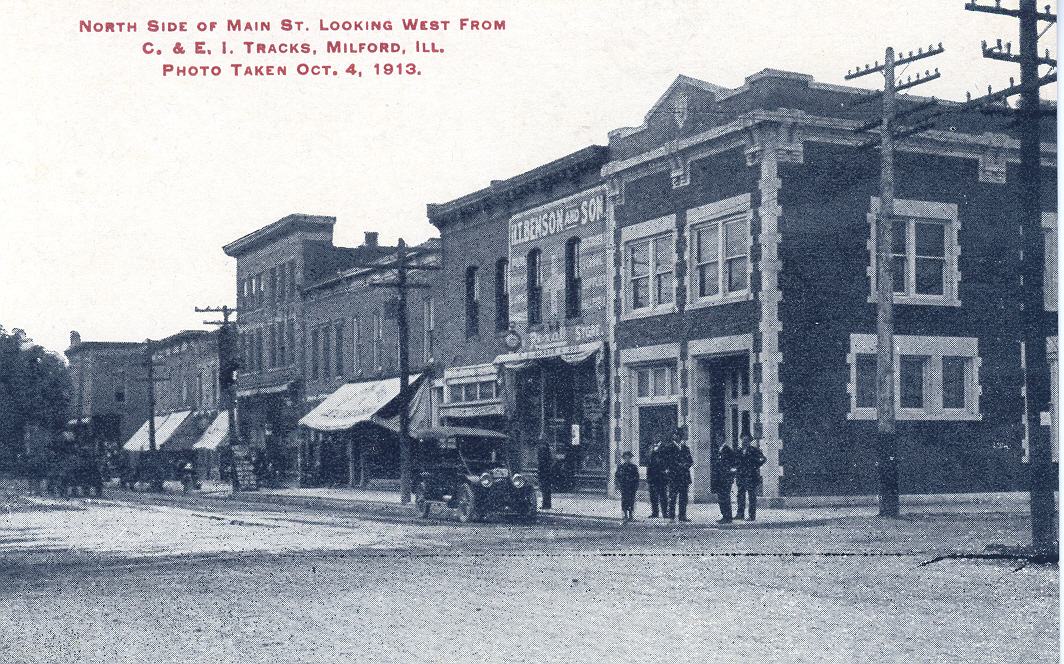 ![]() Jones Street Looking East Added in 2000 From the Lucy Green Collection ![]() Main Street North Side of Main Street Looking West from C. & E.I. Tracks, Milford, Ill. Photo Taken Oct 4, 1913 ![]() Jones Street ![]() Business Section, Milford Ill. ![]() Jones Street ![]() Axtel Av Looking North, Milford, Ill ![]() Greetings From Milford Ill. Dated on back as 1928 Added January 2005 These photos are from the Iroquois County Genealogical Society Collection |
