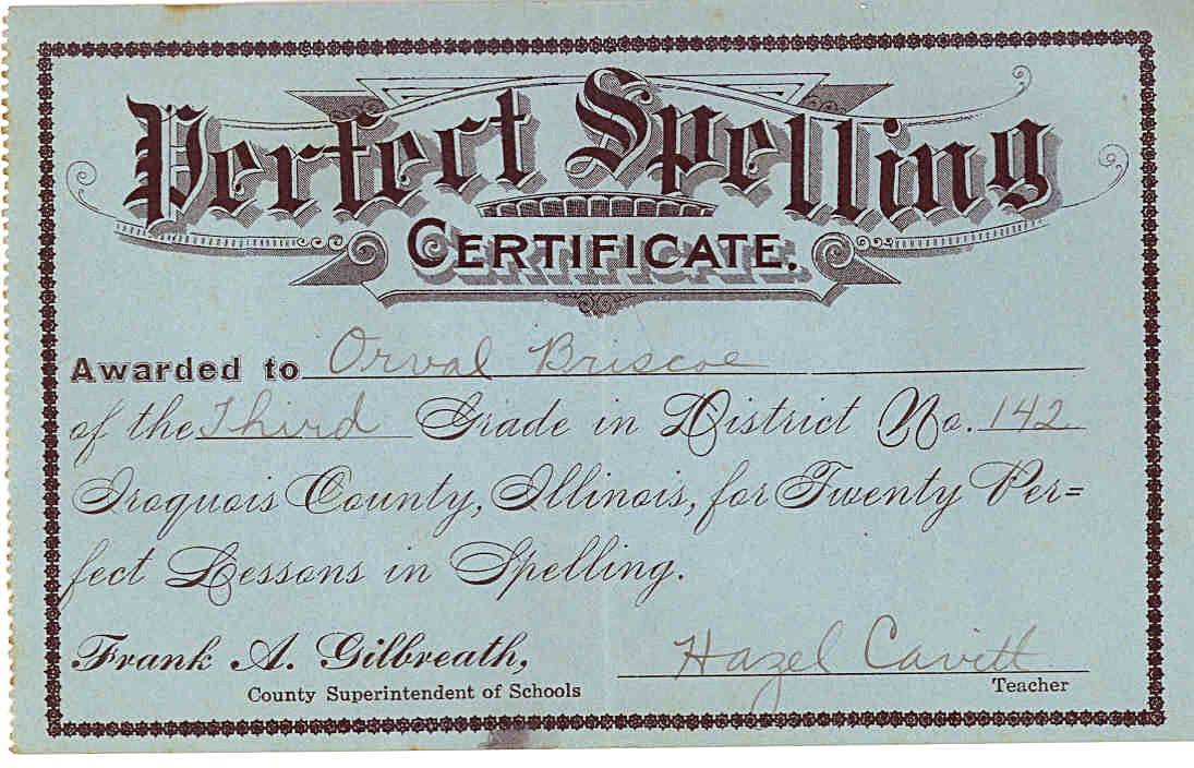 New Athens School![]() Students at New Athens School Front row, girl with sweater with stripes on sleeves and looks like white pinafore, Mabel Briscoe Girl right behind her with hair parted in middle, big collar on dress with white button, Catherine, Briscoe ![]() Glendora Wilson and William Orval Briscoe Glendora was a teacher at New Athens School and William was a student. ![]() Homework Certificate Homework This Certifies that Orval Briscoe Of the First Grade by Industry and Helpful- ness at Home and Good Conduct at School, has earned Five Hundred Credits for Home Work and is therefore awarded this Certificate. Dated at March 19 A.D. 1917 District No. 142 . G.N. Wilson, Teacher ![]() New Athens School Certificate CERTIFICATE OF AWARD THIS CERTIFIES THAT Orval Briscoe of New Athens School, District No. 142 Iroquois County, Illinois, Having received six monthly Certificates of Perfect Attendance for being Neither Absent nor Tardy is commended for Good Attendance and Punctuality, and is therefore entitled to this Testimonial. Given at Watseka, Illinois, this fourth day of of May 1917 Glendora N. Wilson Teacher Frank A. Gilbreath County Superintendant of Schools